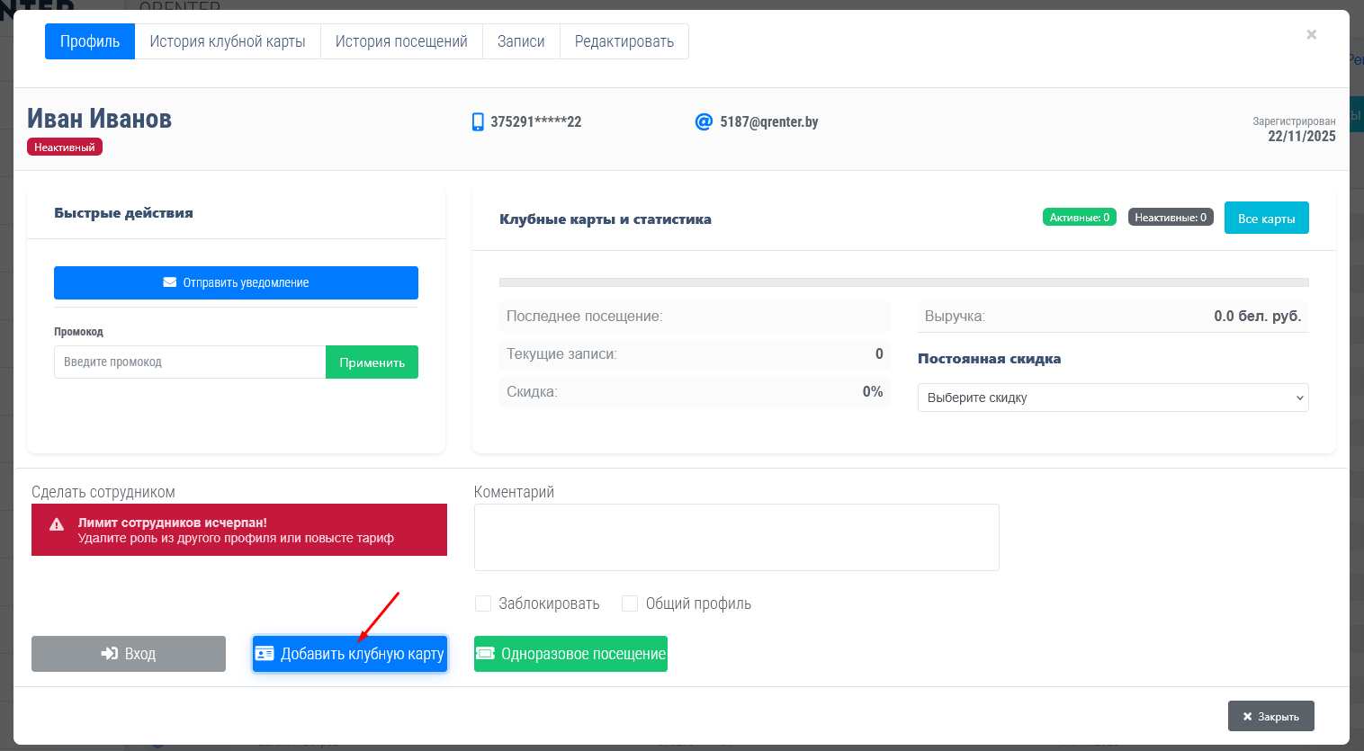 Откроется окно с данными клиента. Нажмите добавить клубную карту.