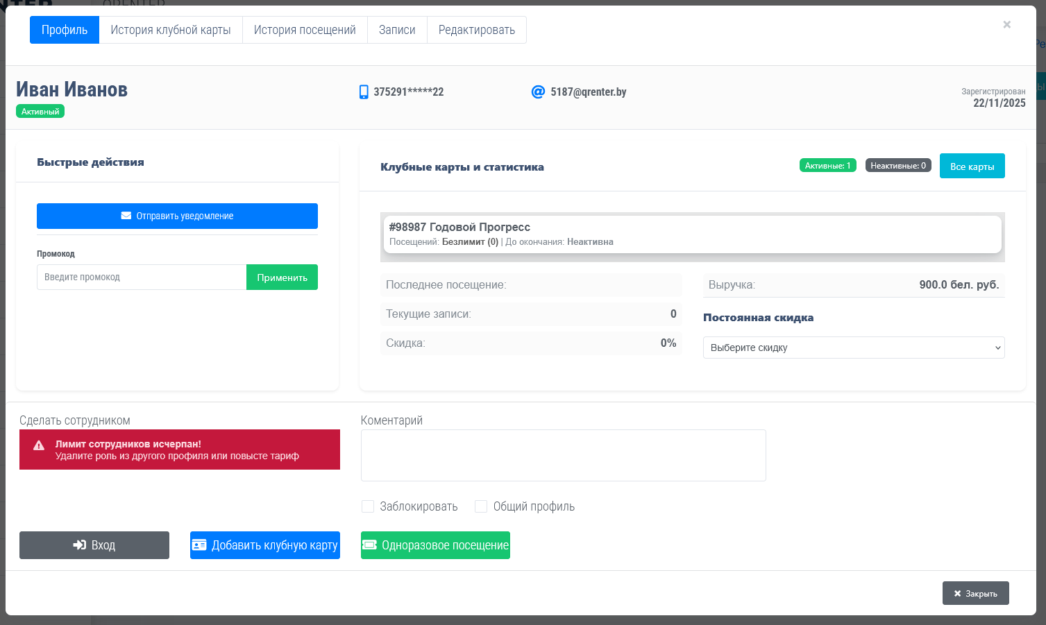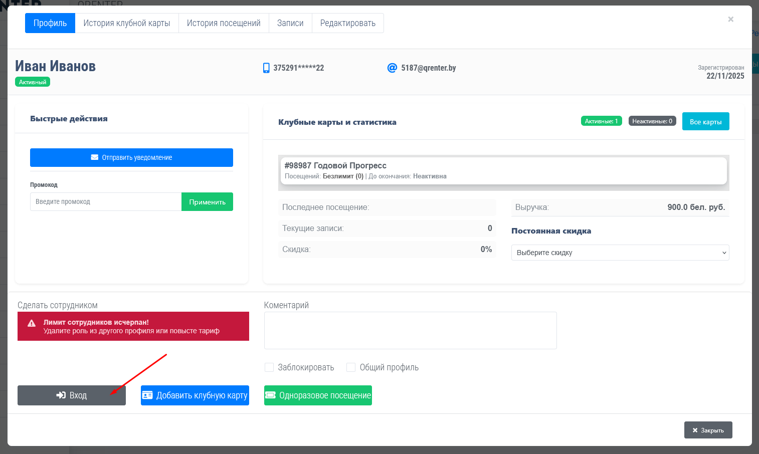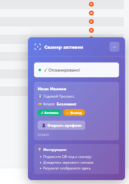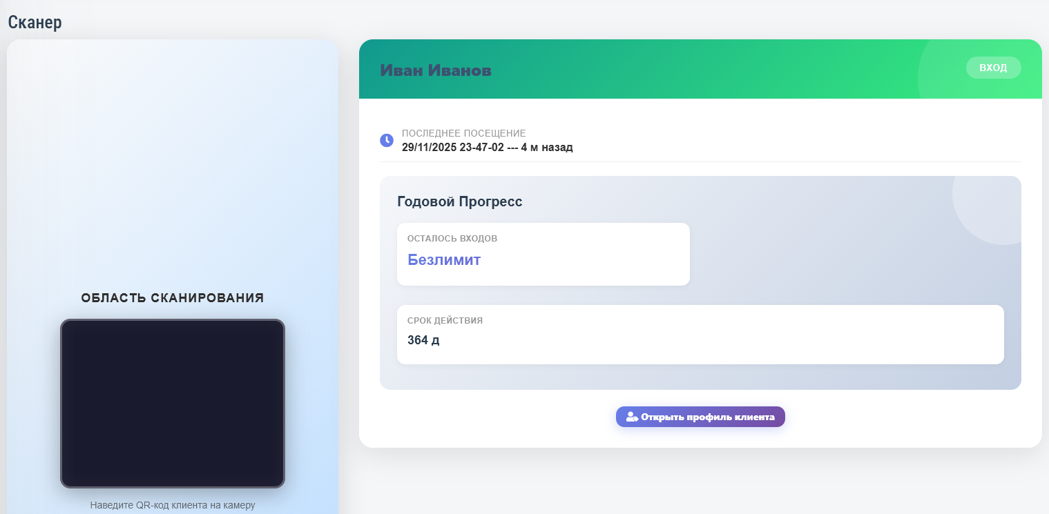 Страница сканера когда был отсканирован QR код, вход защитало автоматически, если у вас клубная карта поминутная то администратору необходимо будет вручную добавить минуты списания и списать.