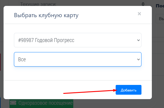 Обратите внимание что у клиента должна быть клубная карта. Если у него нет ее вы можете сделать ему "Одноразовый вход" или добавить клубную карту. Выберите с какой клубной карты списать вход если у клиента их несколько. Так же выберите услугу, по какой он пришел или оставте "Все"