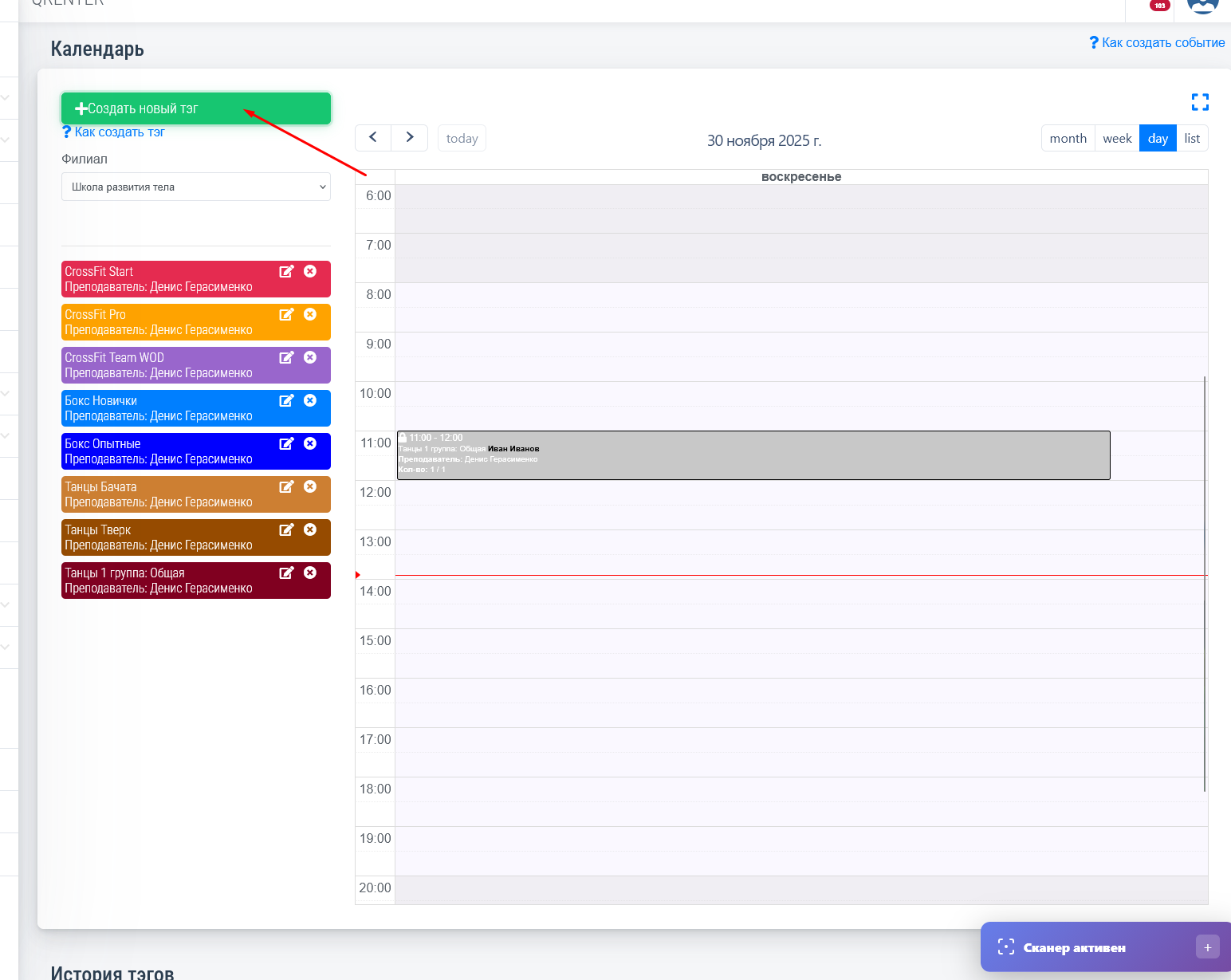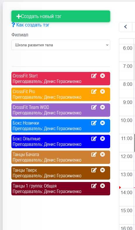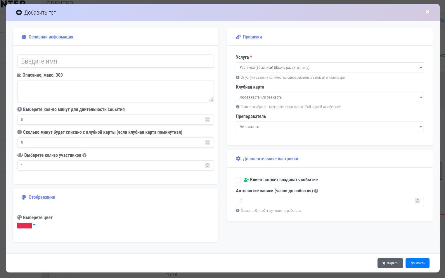 Описание тэга может быть любым, но это описание закрепляетя за тэгом, рекомендуется писать то что характерезует этот тэг. Преподаватель(тренер) может быть добавлен из числа сотрудников компании с ролью "Тренер" как показано ниже. Как создать сотрудника. Кол-во участников означает сколько клиентов смогут записаться на событие. Позже при создании события вы можете изменить кол-во. Если включена функция "Клиент может создавать событие" рекомендуем оставлять кол-во участников равное 1. Т.к. обычно клиент может создавать только персональные события. Но вы можете на своё усмотрение регулировать параметры. Цвет тэга для более быстрого зрительного поиска в календаре. Можно выбрать длительность события в минутах, и так же если клубная карта поминутная можно выбрать сколько будет списываться минут. Если клиент записан в календаре и пришел на занятие и отсканировал QR код за 15 минут до начала занятия, минуты или занятия будут списаны автоматически. Так же необходимо выбрать услугу. От нее будет зависеть сколько одновременных записей может быть создано. В течении этого события