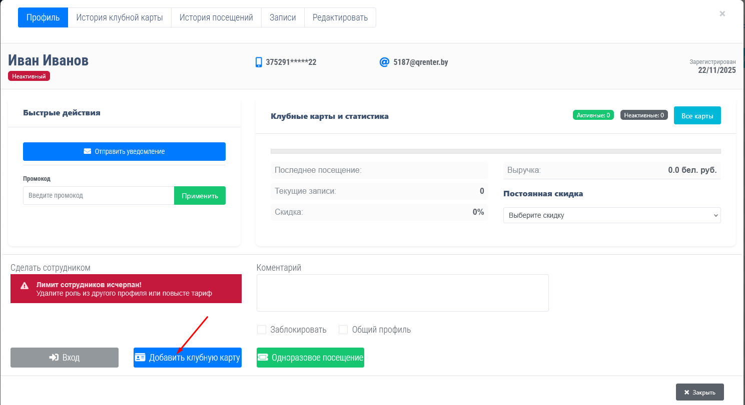Откройте профиль клиента и нажмите "Добавить клубную карту"