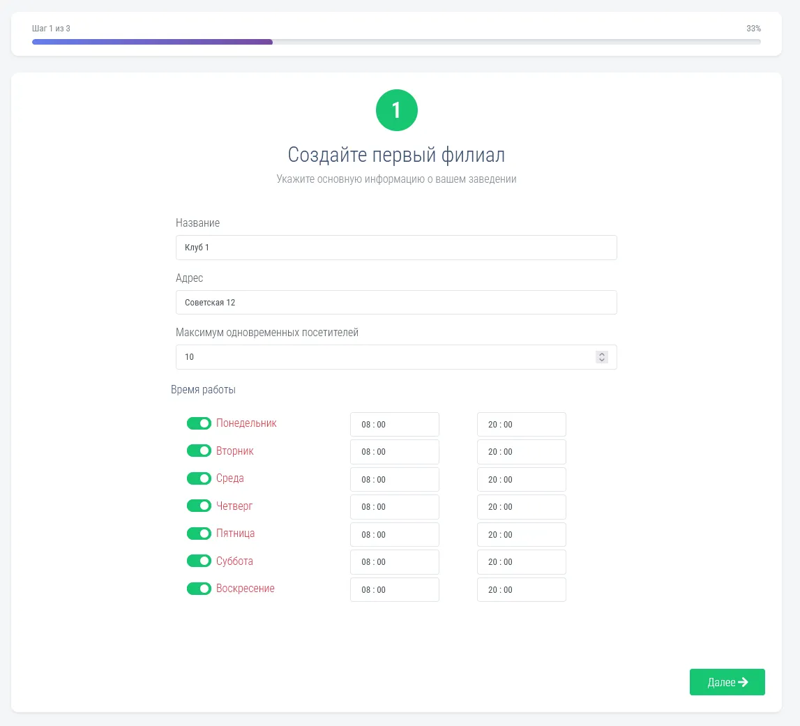 - Максимум одновременных посетителей — укажите максимальное количество людей, которые могут одновременно находиться в зале