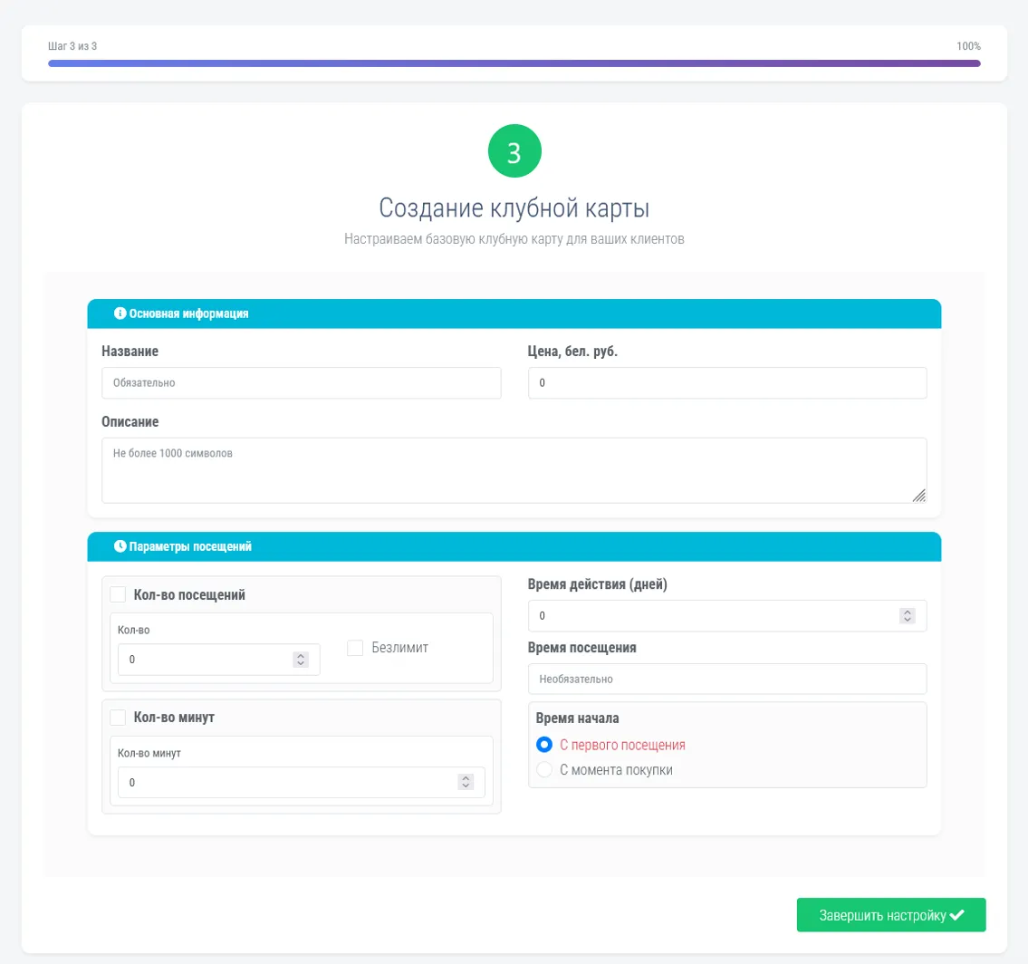 Настройте базовую клубную карту для ваших клиентов. Это абонемент, по которому посетители смогут приходить в ваш клуб.