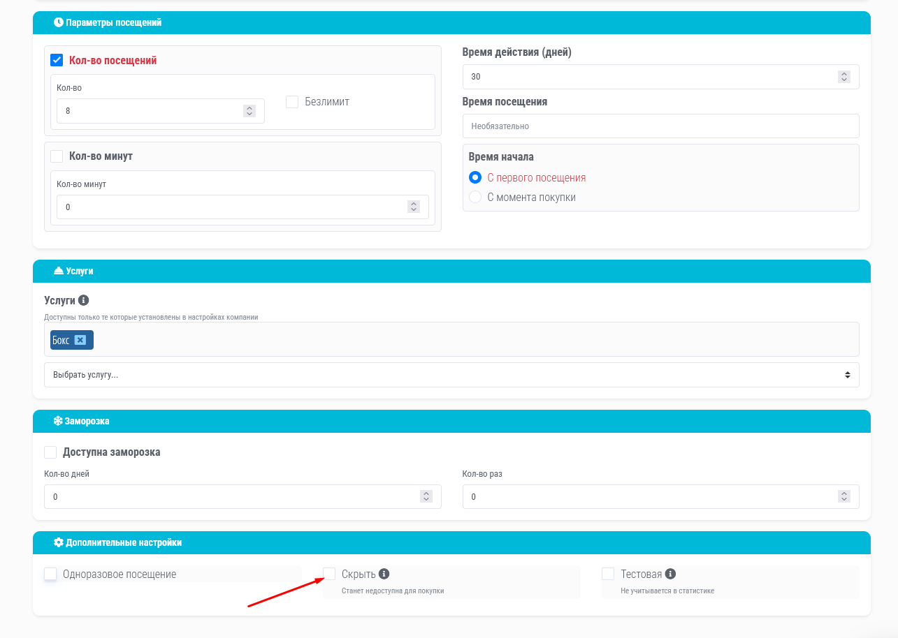 Из компании удалить клубную карту нельзя, её можно только скрыть. Что это означает. Нажимая скрыть вы убираете клубную карту из доступных карт для продажи клиентам. Если у клиента уже есть купленная клубная карта то клиент может ей воспользоваться даже если она ещё не активированна. Что бы скрыть клубную карту нажмите на ту которую хотите скрыть.