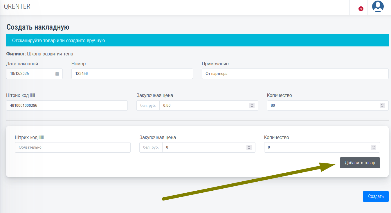 Способ А (ручной): Введите Штрих-код, Закупочную цену, Количество. Для добавления следующей позиции нажмите «Добавить товар».