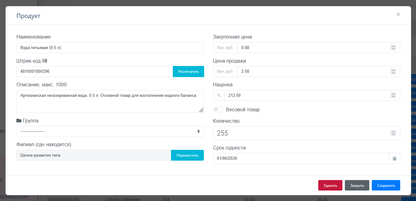 Учёт: Весовой товар, Количество (остаток в этом филиале), Срок годности.
