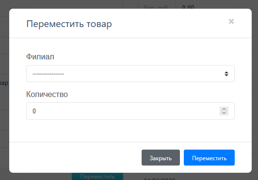 Кнопка «Переместить» – для передачи товара между филиалами (см. ниже).