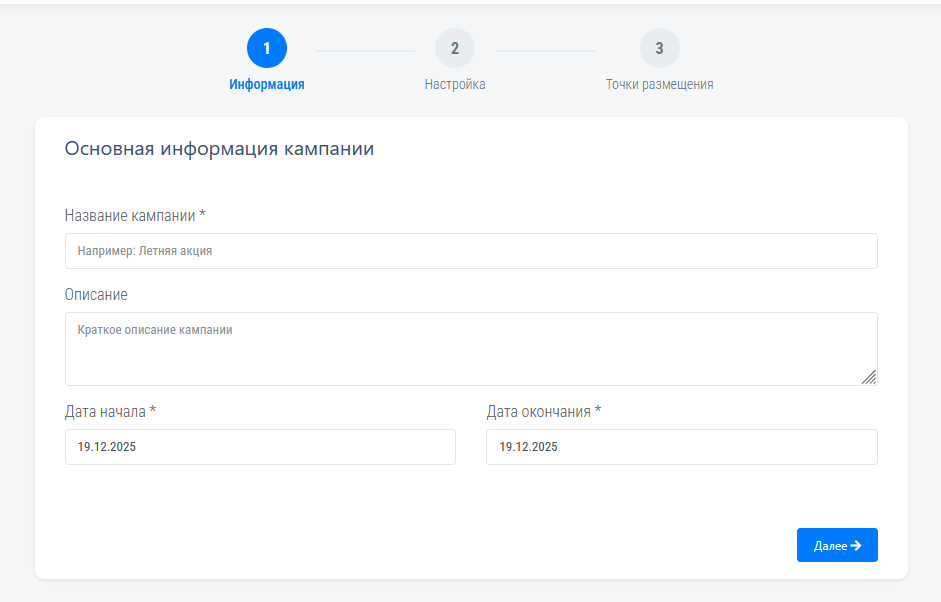 Откроется окно создания кампании, состоящее из трёх шагов: Информация, Настройка, Точки размещения.
