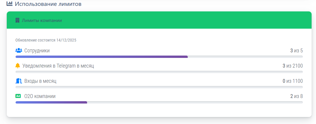 Если какой-либо лимит (например, «Сотрудники», «Уведомления в Telegram», «Входы в месяц» или «O2O компании») приближается к максимальному значению: