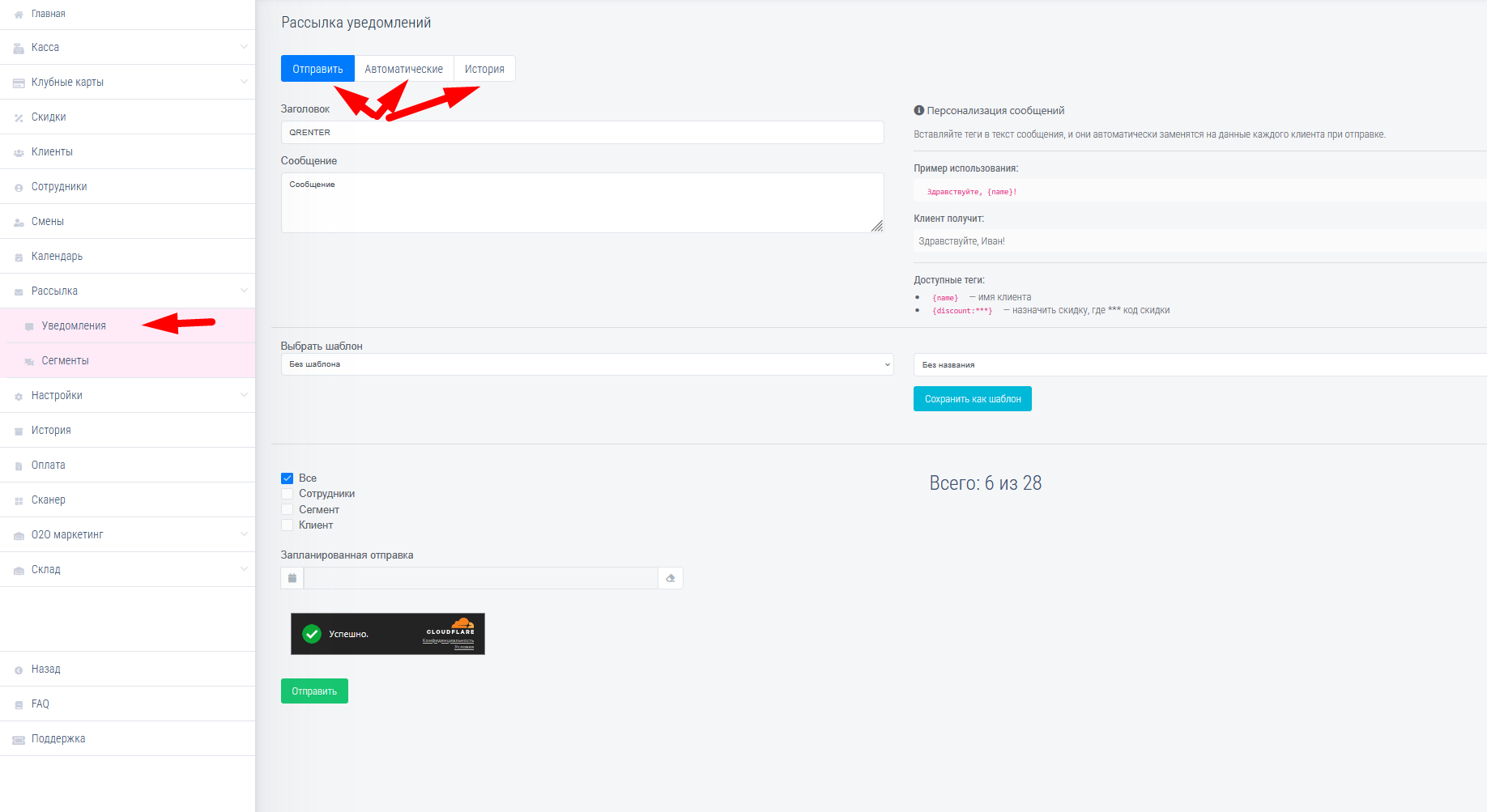 Раздел предназначен для отправки сообщений клиентам через Telegram-бота вашей компании. Здесь можно создавать как разовые, так и автоматические рассылки.