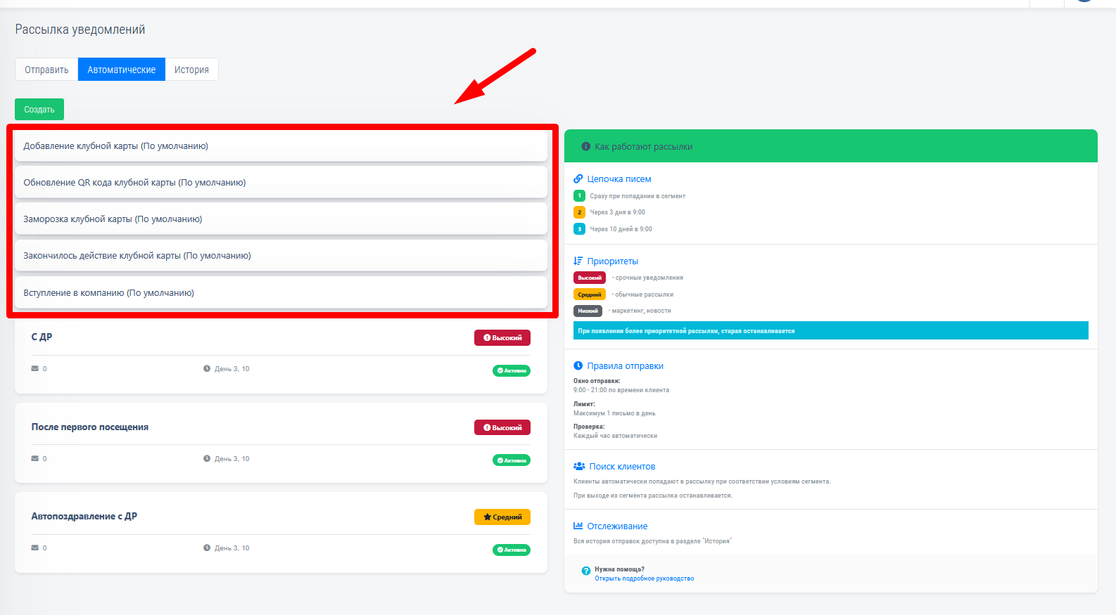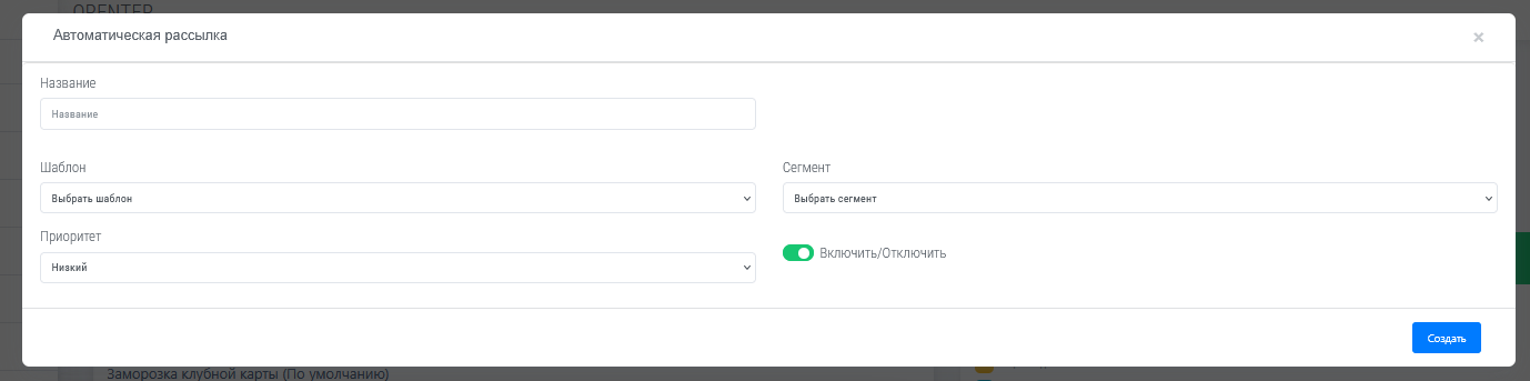 Сегмент: Выберите сегмент клиентов, при попадании в который начнётся рассылка.