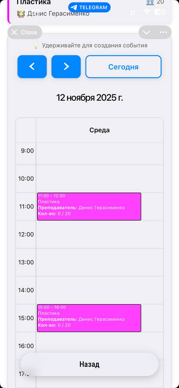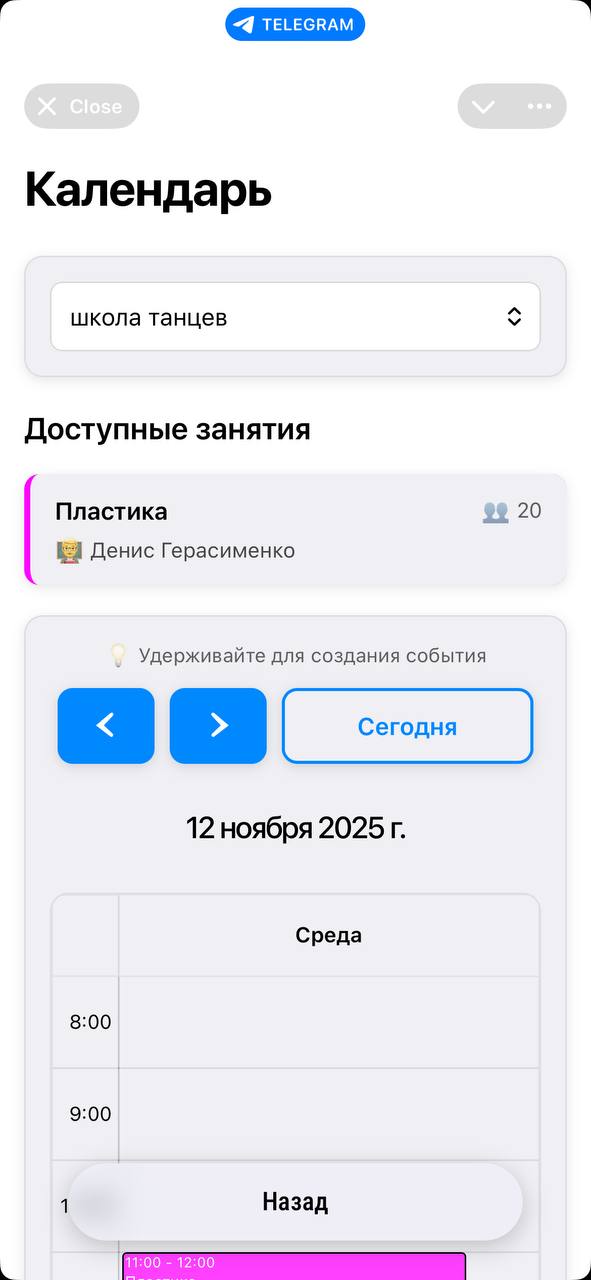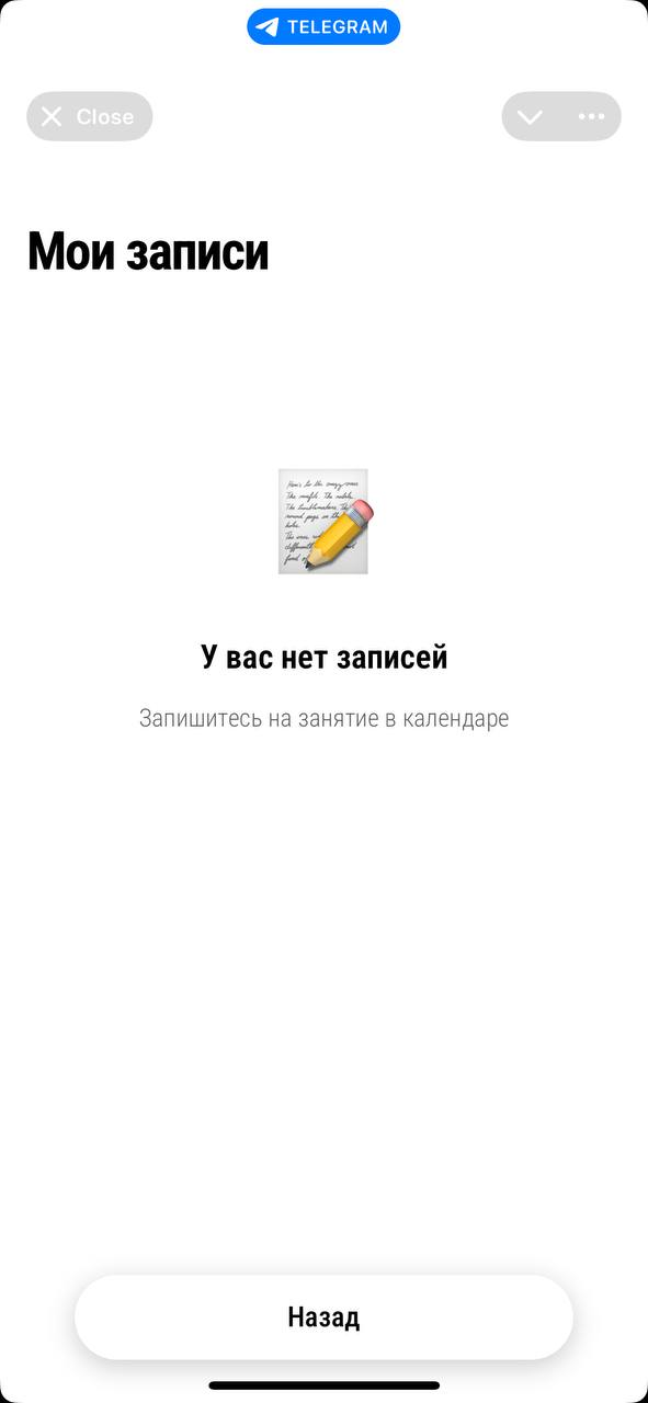 Клиент записывается на занятия или процедуры прямо через бота. Видит свободные слоты, выбирает удобное время и подтверждает запись.