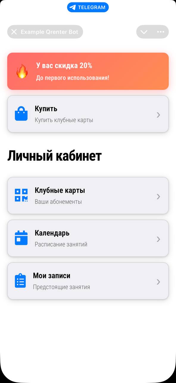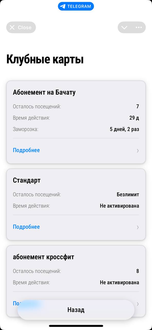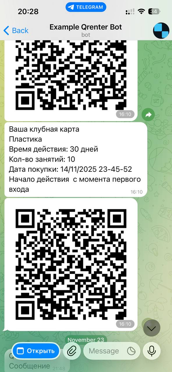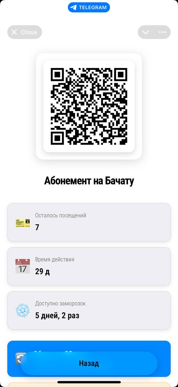 Клиент просто показывает QR-код из бота при входе - администратор сканирует и видит всю информацию о клиенте и его абонементе.